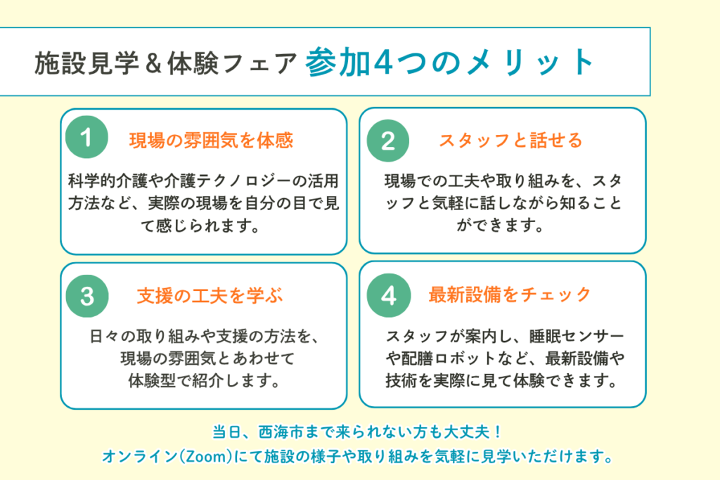 科学的介護や介護テクノロジーの活用方法など、実際の現場を自分の目で見て感じられます。