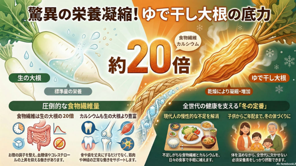 ちなみにですが、ゆで干し大根は、生の大根と比べて栄養面でも優秀な食材なんです。