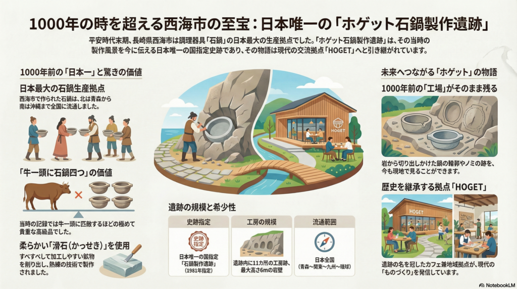 その石鍋づくりの中心地として残っているのが、西海市大瀬戸町にある「ホゲット石鍋製作遺跡」です。
