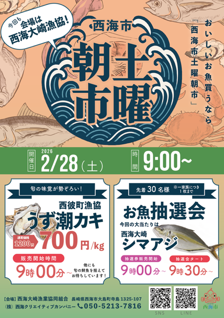 西海市内の4つの漁協(大瀬戸町、西海大崎、西彼町、瀬川)が共同で開催している人気イベント「西海市土曜朝市」が、2月28日(土)に今年度最後の開催を迎えます。