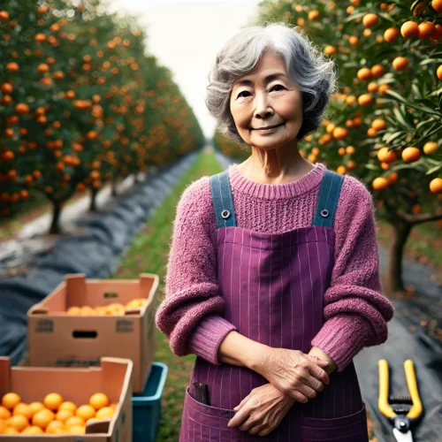 DALL·E-2024-08-30-15.51.58-A-70-something-Japanese-woman-named-Mika-who-is-a-local-citrus-farmer-in-Nagasaki-standing-in-a-mandarin-orange-orchard.-She-is-dressed-in-a-purple-