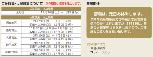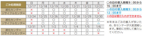 ごみ収集は全地区で12/30(土)~1/3(水)までお休みになります。